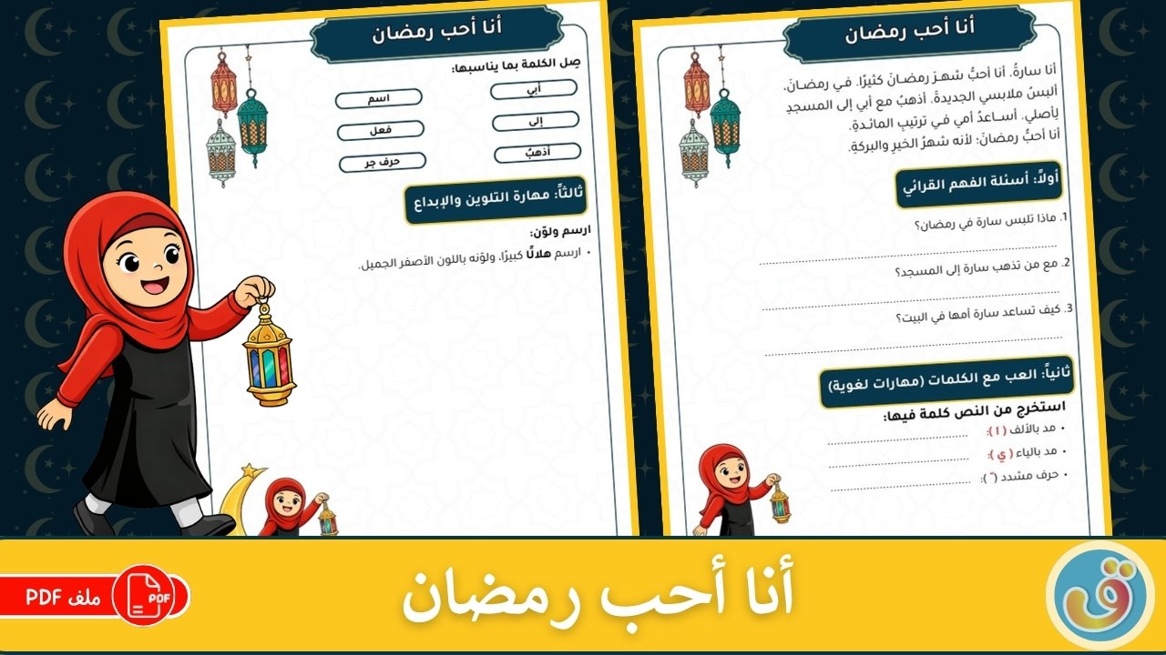 حمّل الآن أوراق العمل “أنا أحب رمضان” وابدأ بتعليم طفلك أو طلابك أجمل قيم الشهر الفضيل بطريقة مشوّقة وسهلة! اجعل القراءة ممتعة، ودع رمضان يكون فرصة لبناء اللغة، القيم، والذكريات الجميلة عند الأطفال.