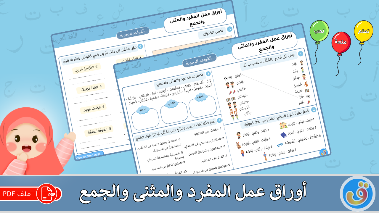 تشمل تمارين متنوعة ومتدرجة تساعد المتعلمين على التمييز بين المفرد والمثنى والجمع بطريقة تفاعلية وممتعة.