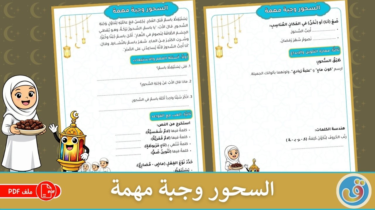 هل تبحث عن وسيلة ممتعة وتعليمية تغرس المفاهيم الإيمانية والصحية لدى طلابك أو أطفالك؟ هل ترغب في تدريس أهمية السحور للأطفال بطريقة مبسطة، مليئة بالتفاعل والإبداع؟ إذًا، أوراق العمل “السحور وجبة مهمة” هي الخيار المثالي لك! تم تصميم هذه الموارد خصيصًا للأطفال في المرحلة الابتدائية (من الصف الأول حتى الصف السادس، وتصلح أيضًا كنشاط إثرائي لبعض طلاب المرحلة الإعدادية)، لتقديم مفهوم السحور خلال شهر رمضان بطريقة شيقة ومتكاملة لغويًا وتربويًا.