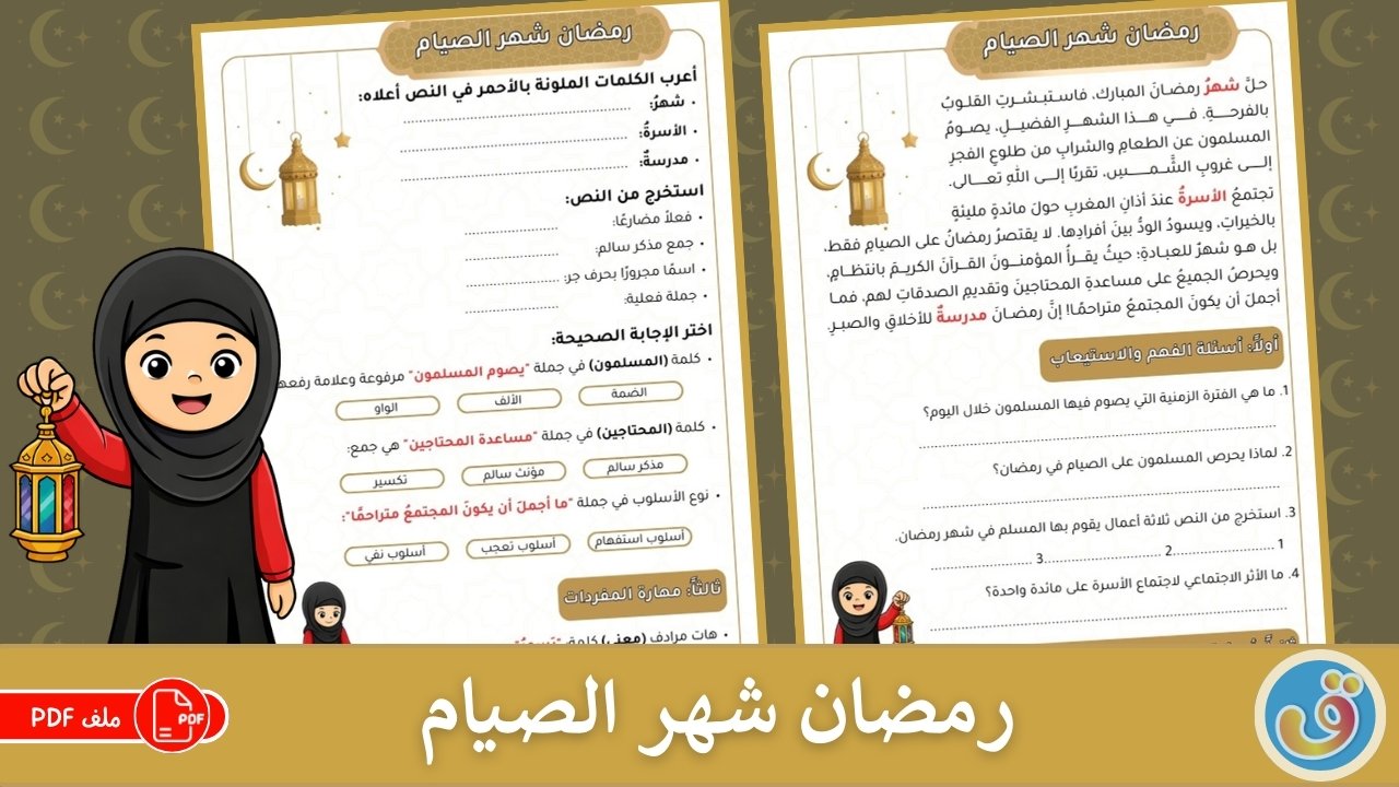 نص قرائي معبّر بعنوان “رمضان شهر الصيام” يناقش فضائل الشهر الكريم، العبادات، الأخلاق، الروابط الأسرية، والعمل المجتمعي