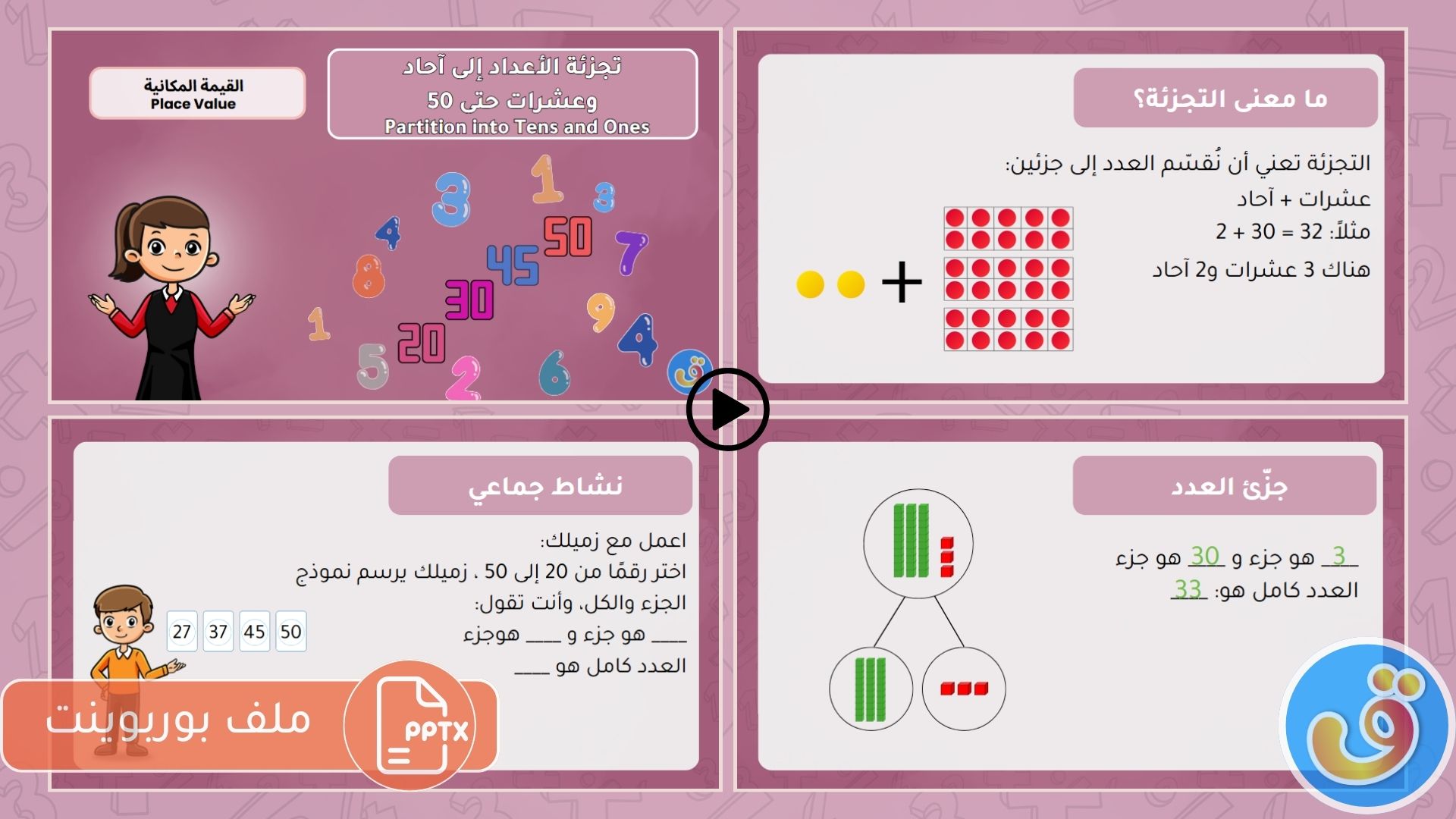 القيمة المكانية: تجزئة الأعداد إلى آحاد وعشرات حتى 50 – بوربوينت تجزئة الأعداد إلى آحاد وعشرات حتى 50